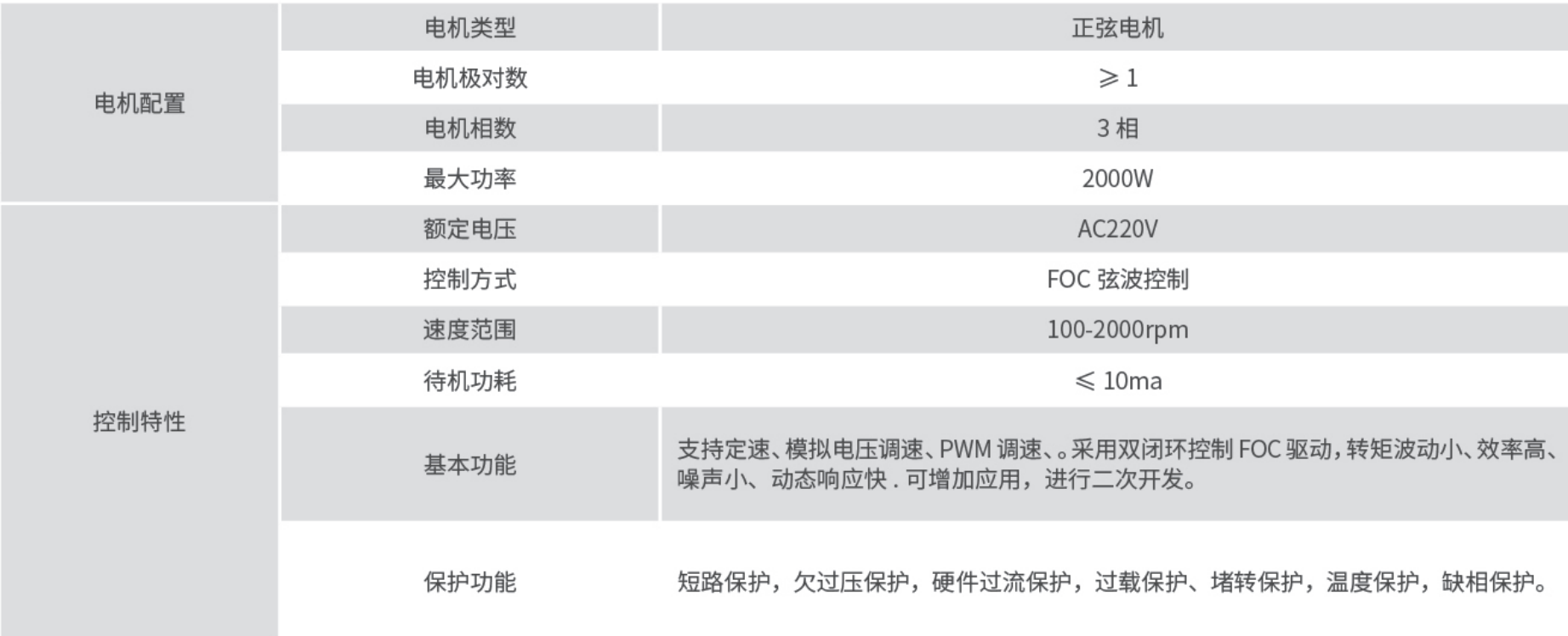 支持 AC220V 供电 功率高达 2KW,可以自由选配 PFC 功能,平衡性能和成本的优点,功率因数高于 0.99,并具有低损耗和高可靠等优点。控制方式采用FOC 控制,提高转矩波动小、效率高、噪声小、动态响应快.内置可靠保护,欠过压保护,过流保护,堵转保护,温度保护,缺相保护,避免烧毁电机,提高电机可靠性。